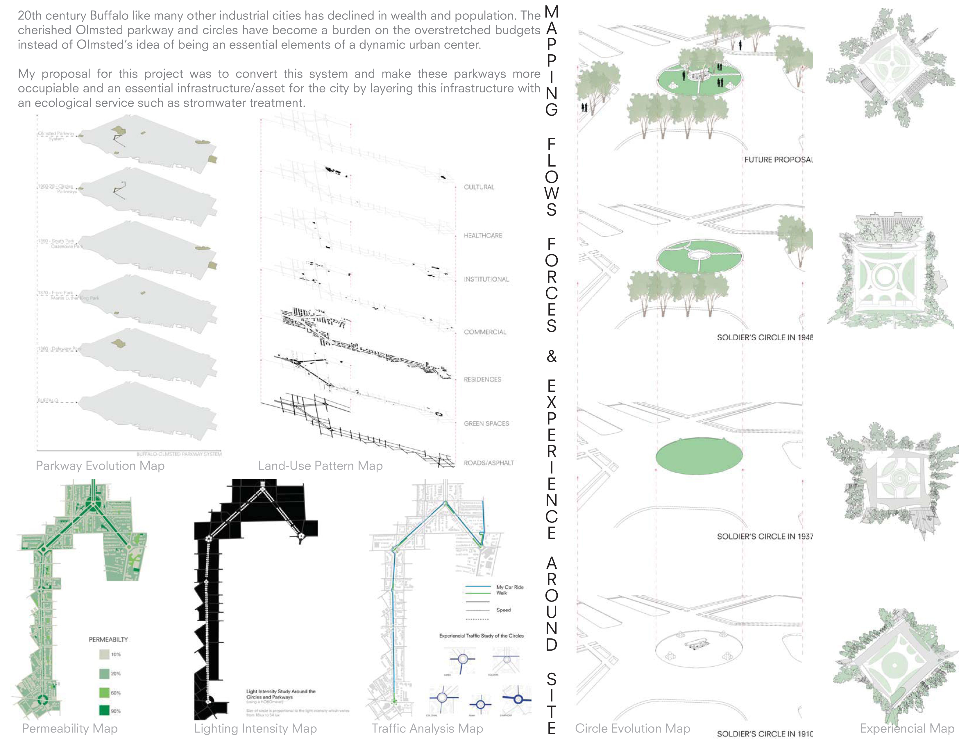 This studio delved into the infrastructure of the city of Buffalo in search of opportunities to re imagine and re purpose outsized or under utilized elements / areas into distributed networks of ecological services – “ecological infrastructures”. It broached the question of how the redundant systems of this city can provide for ecological as well as (or in place of) human function.