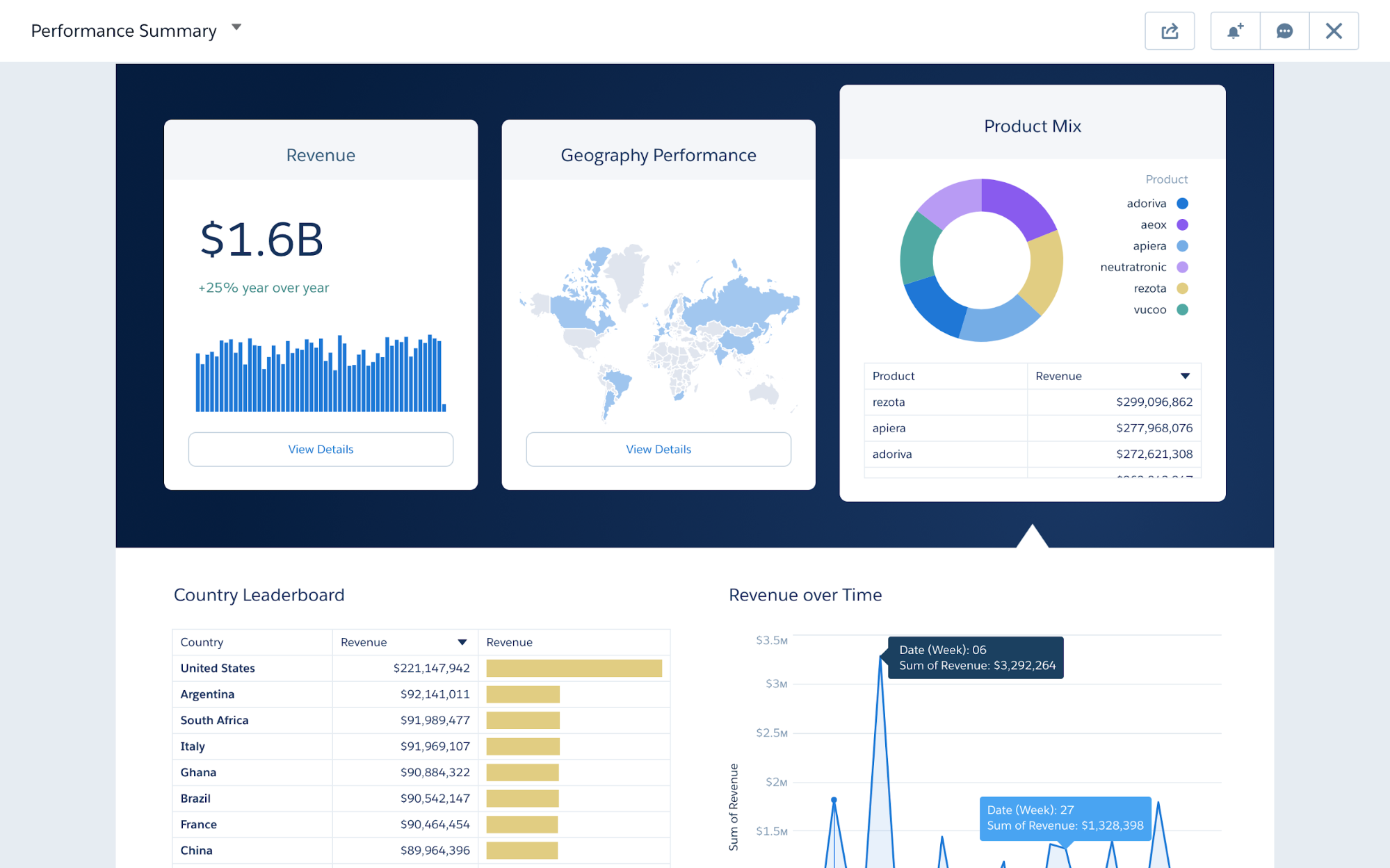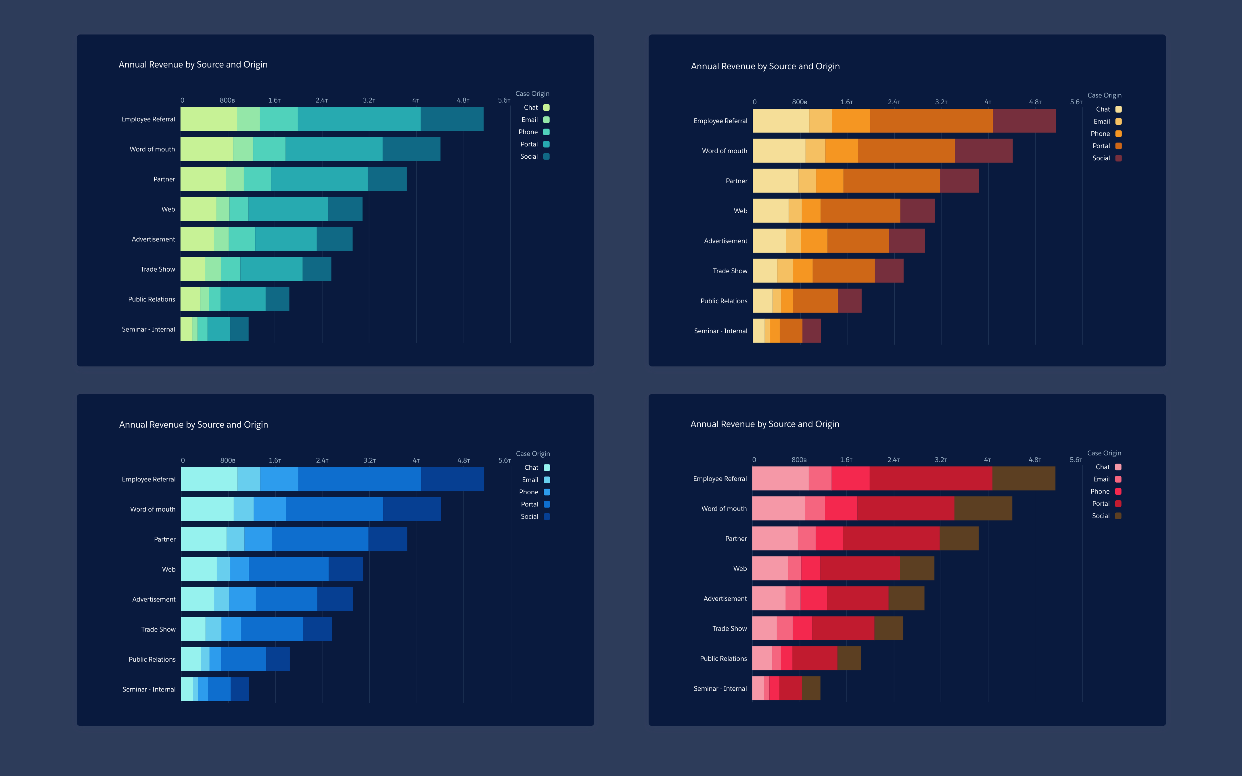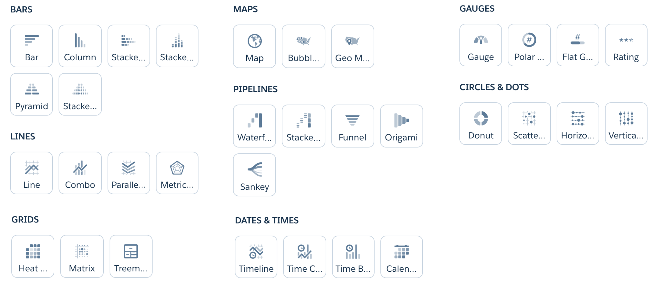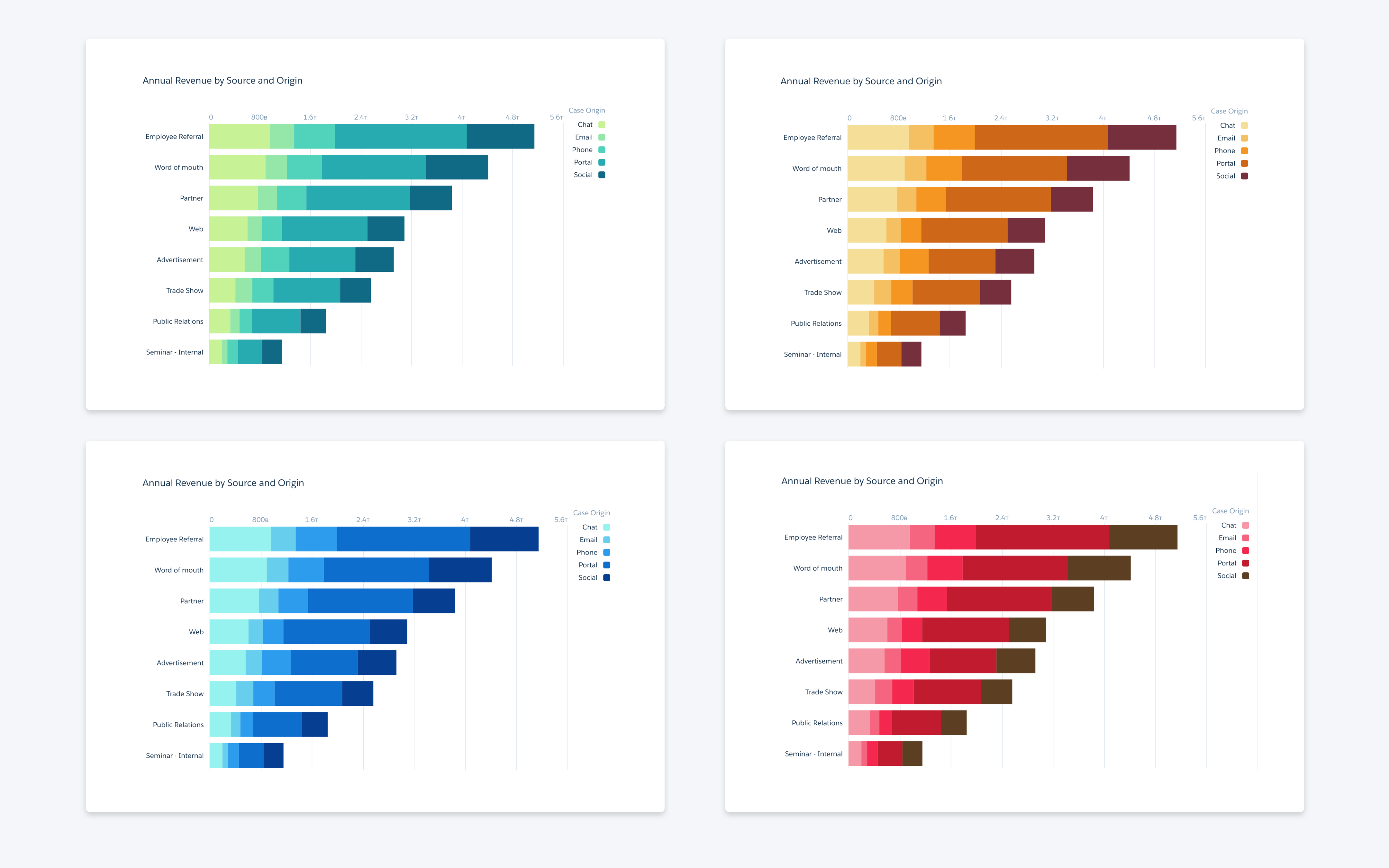 Since it's launch in 1999, Salesforce used a third party charting technology to power all visualization. In 2013 a team in Salesforce Analytics Cloud re-wrote their charting library from scratch. This charting library was implemented in JavaScript which renders in HTML5 Canvas. I was the first designer on this team and since then we have shipped over 30 different customizable charts over the last four years.