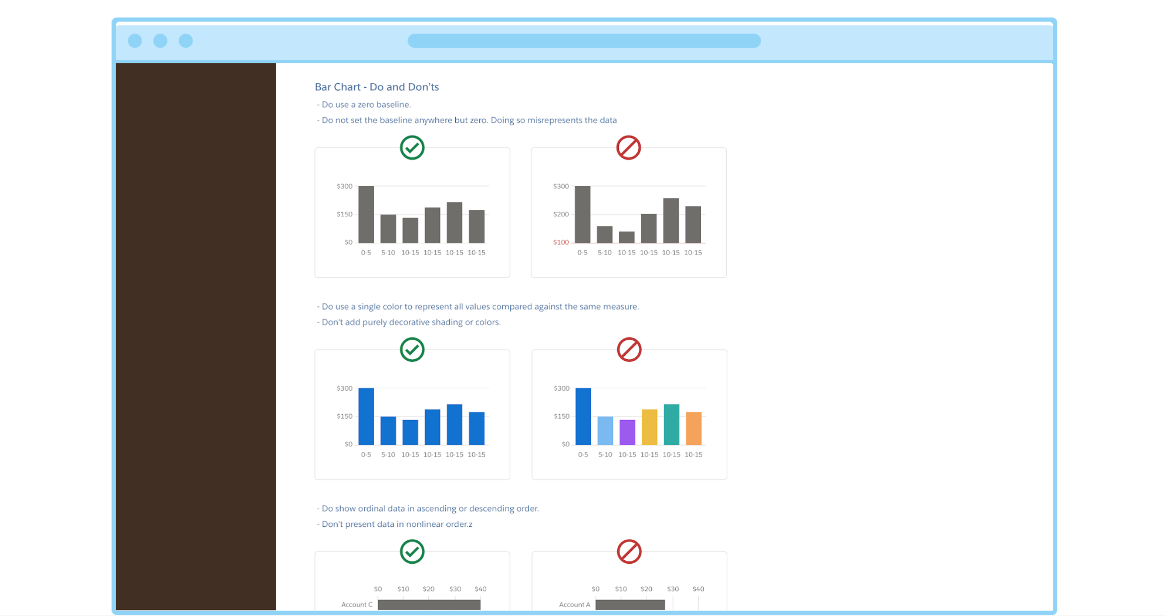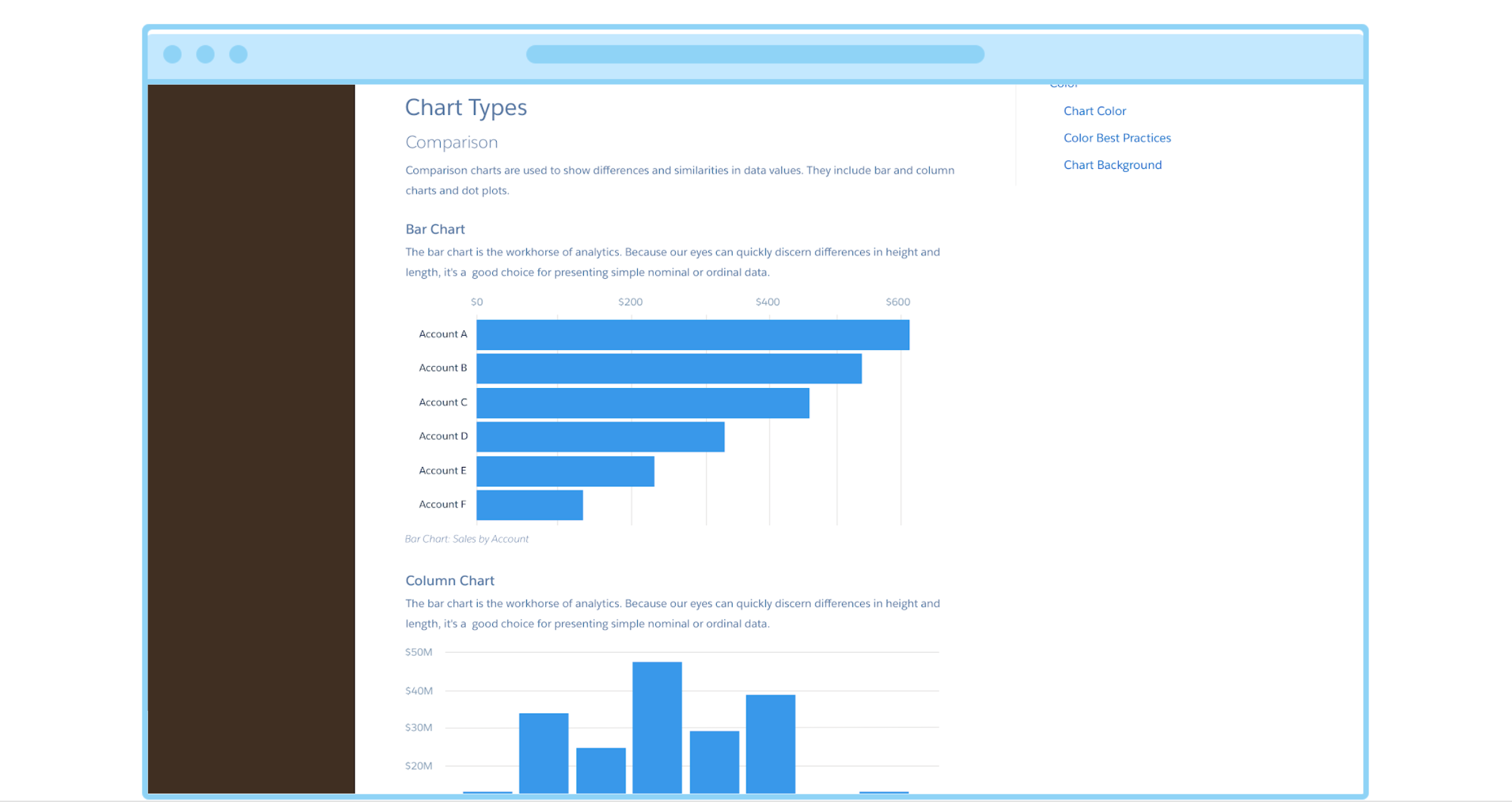 Since our charting platform has matured, it's being adopted within various teams at Salesforce. Being the only designer on this team I get a lot of questions about charting best practices, sketch kit and what type of chart to use for a specific use case. For the past one month, I have been working with the Salesforce Lightnign Design Team a chartung section in our design system, so that other designers and stakeholders in Salesforce and our customer can learn more about data vizualizations.