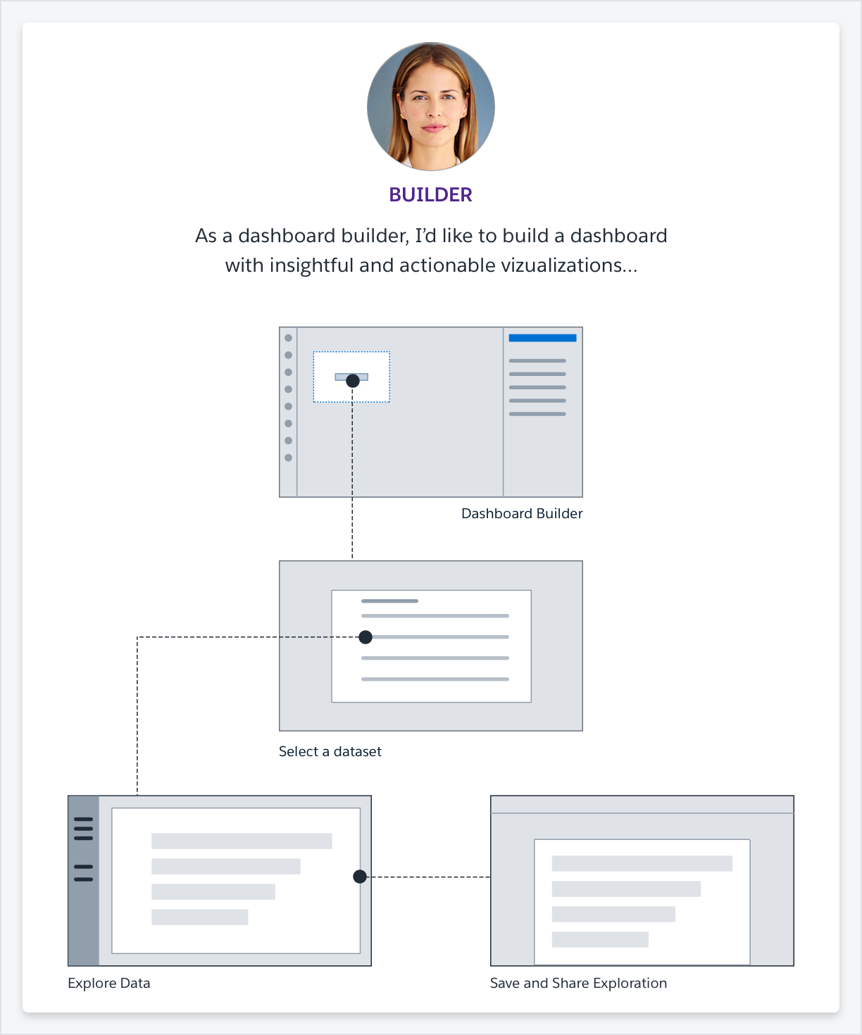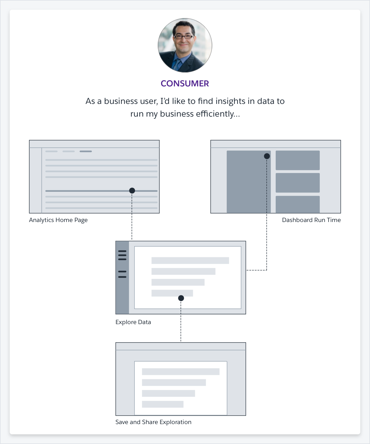 - Consumer - business user like an exec or manager, who is looking at a dashboard and wants to explore a chart to find more isights