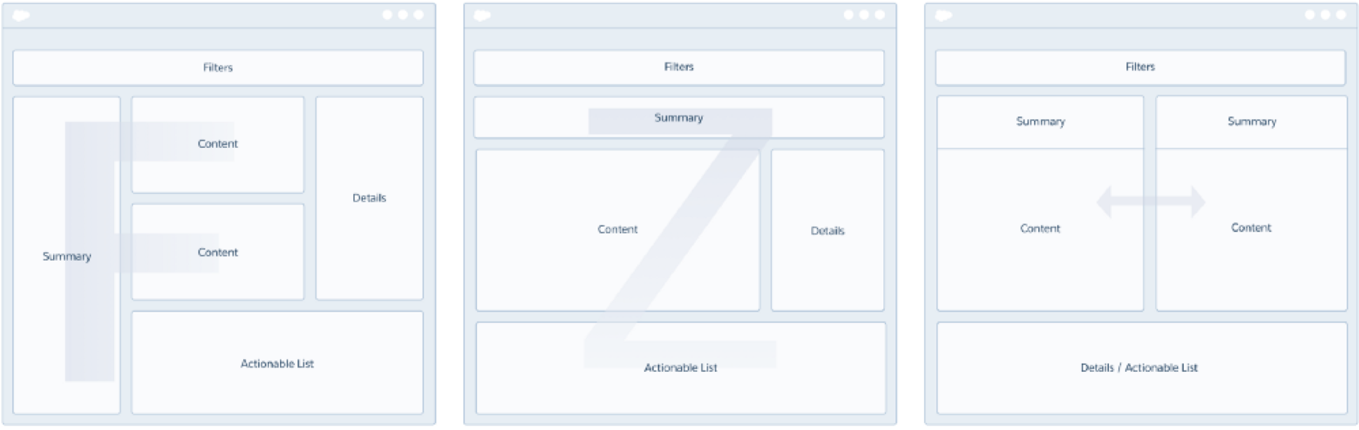 Pages can be laid out like a newspaper or article where they have a summary, content and conclusion. F, Z, and Side by Side layout were the most common layout we used for pages. These patterns help get the user’s attention to the summary KPIs first, followed by supporting visualizations and a detailed actions list at the end.